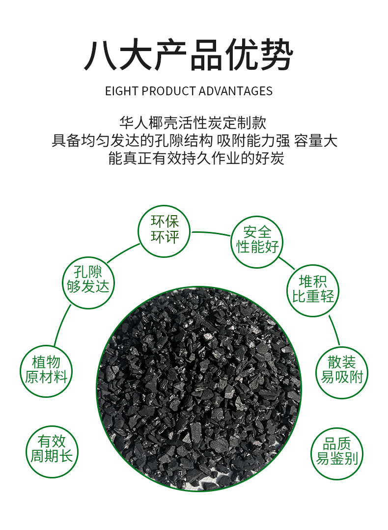 椰壳活性炭采用椰子壳为原料精制而成,外形为不定形颗粒,具有机械强度高,孔隙结构发达,比表面积大,吸附速度快,吸附容量高,易于再生,经久耐用等特点。主要用于食品、饮料、药用活性炭、酒类、空气净化活性炭和高纯饮用水的除臭、去除水中重金属、除氯及液体脱色。并可广泛用于化学工业的溶剂回收和气体分离等。