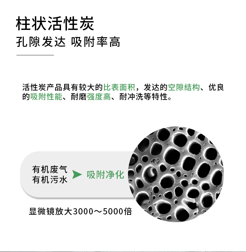柱状活性炭,以椰壳、木屑、优质煤为原料,经过一系列生产工艺精加工而成,外观呈黑色圆柱形颗粒,广泛应用于气体处理、溶剂回收、脱硫脱硝、空分设备、制氮机和喷漆车间等领域。煤柱活性炭具有吸附能力强、比面积大、缝隙结构发达、机械强度高、化学稳定性好、床阻力小、易再生和耐用等优点。