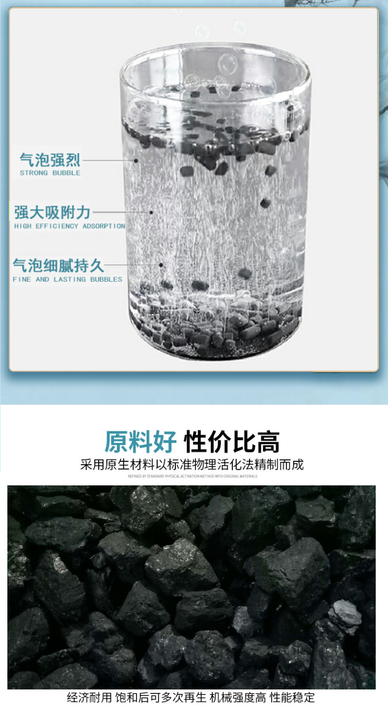 将一小把活性炭投入水中,由于水分子小,水会逐渐浸入活性炭的孔隙结构中,迫使孔隙中的空气排出,从而产生一连串极为细小的气泡,在水中拉出一条细小的气泡线,同时会发出丝丝的气泡声,性能越好的活性炭这种现象越剧烈。时间越久。