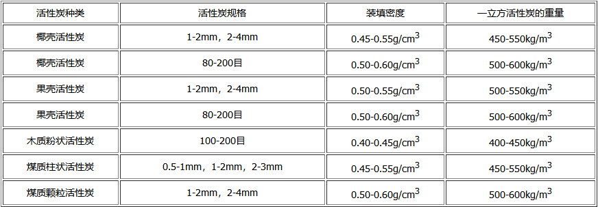 下表是竹之韵活性炭厂家根据我公司产品的实际情况,为大家总结几种不同类型活性炭产品的装填密度,以及不同规格、种类活性炭一立方的重量,希望对大家有所帮助。